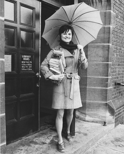 Outreach Librarian, 1971 Coventry Library's outreach librarian Mary Mays carries a handful of books to elderly or disabled readers on a rainy day in 1971. By this time, Coventry Library was no longer the main library for the Heights Libraries. Source: Cleveland Heights-University Heights Library Creator: Norbert J. Yassanye