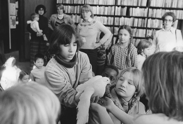 Critter Show, December 1978 Children hold a bird at the Critter Show held in Coventry Library. Four years earlier the library had sold its building to the Fairmount Center for Creative and Performing Arts, a Geauga County-based non-profit organization, from which it leased two rooms to keep the library branch functioning. Source: Cleveland Heights-University Heights Library Creator: Joyce Deep