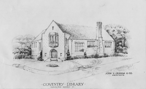 Designed by John H. Graham & Co., which also drew plans for Fairmount Presbyterian Church nearly a decade before, the Coventry Village Library opened as the main library for Cleveland Heights in 1926. Built on land originally platted as part of Grant W. Deming's Forest Hill residential allotment, the library, along with Coventry School, were the only non-residential structures in Deming's development.
