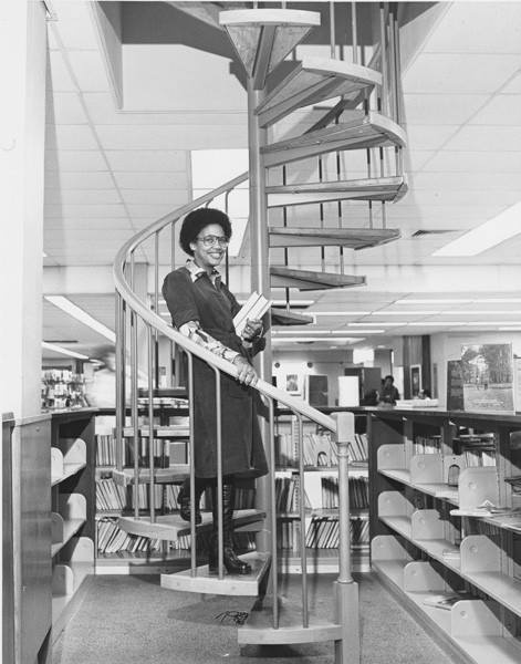 Spiral Staircase, ca. 1970s Patricia Pasqual was the library's adult services assistant librarian. Here she carries books down the spiral staircase from the second-floor shelf area. Source: Cleveland Heights-University Heights Library Creator: Herbert Ascherman Jr.