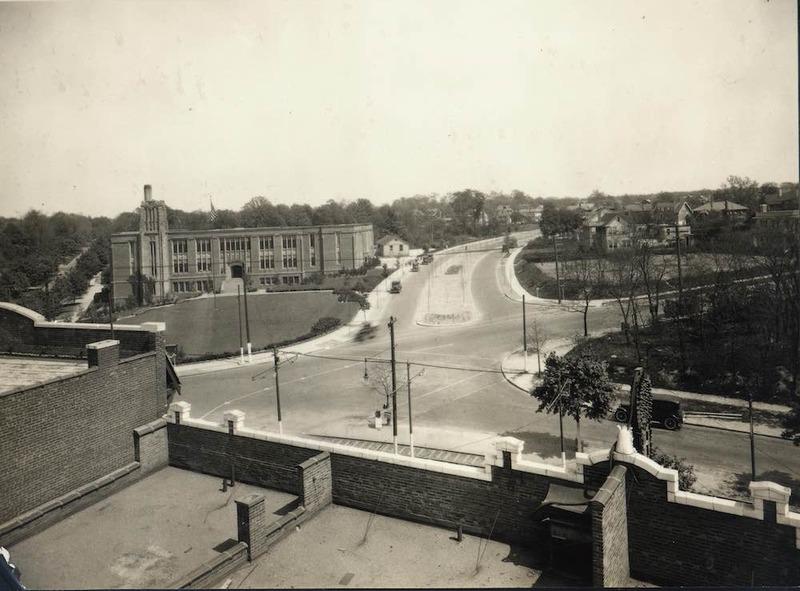 Coventry School Viewed from Top of Heights Art Theatre, 1922 Note how close to the intersection the school sits compared to its successor. Also noteworthy are that 1) Washington Boulevard ran all the through to Coventry Road, 2) a small temporary classroom building sat on what later became the upper playground, and 3) no structure yet occupies the site that, in 1926, became the Cleveland Heights Library. Source: City of Cleveland Heights