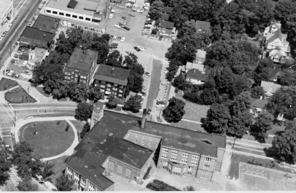 Aerial View of Coventry School, ca. 1960s An addition to Coventry along Euclid Heights Boulevard added eight classrooms to the original twelve. The three-story addition proved vital for properly serving the growing enrollment, particularly from the duplex-rich neighborhood north of Mayfield Road. This photo shows homes along Rock Court which later gave way to parking. The gas station at the corner, replaced with a bank in the 1970s, is the second one on the site. The first one was a Gulf station that was designed to look like an English cottage. Source: Cleveland Memory Project, Cleveland State University Library Special Collections