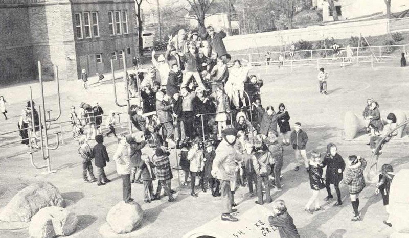 View of Lower Playground, ca. 1971 Directly behind the pyramid of kids you can see a house that bordered Rock Court, which is now part of the large parking lot that serves Marc's. Source: Coventry School