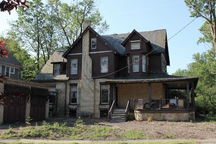 Yellow Brick House, 2012 Yellow pressed brick was very popular in early suburban developments in Chicago but largely unknown in Cleveland until M. M. Brown built the first houses in his allotment. This house, built on spec in 1898 at 1779 Cadwell Avenue on the corner of Hampshire Roadl, made ample use of this yellow brick. Unable to find a buyer, Brown rented the house for several years before famed vaudeville actor Ezra F. Kendall purchased it in 1906. Later the house belonged to Marcus Feder, who was known as the "Father of the American Cigarette." The house, which sat empty over 60 years, was demolished in 2013 and is now a park called Spirit Corner as a nod to the belief that the house was haunted. Source: J. Mark Souther