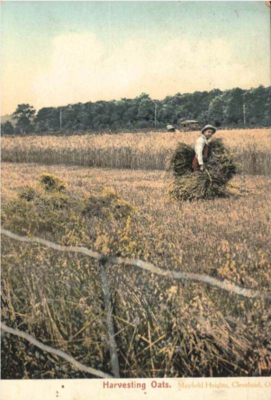 Harvesting Oats, ca. 1906 On the eve of the development of M. M. Brown's suburban allotment, the land was quite rural, as this early postcard suggests. Although this card dates to the early 1900s - after Mayfield Heights was developed - it was not unusual for postcards to depict earlier scenes. It also was not unusual for suburban allotments to lend their name to their immediate surroundings, so this scene may have been on a nearby farm. Source: Cleveland Memory, Cleveland State University Library Special Collections