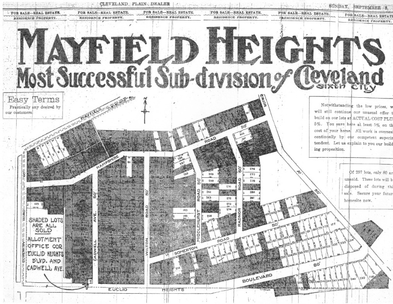 Mayfield Heights Ad, 1909 Despite the claim of "success" in this 1909 ad in the Plain Dealer, following the Panic of 1907, Brown's allotment struggled, leading the Cleveland Trust Company to take control of land sales. A. B. Cramer of the City & Suburban Realty Co. managed the ongoing development of Mayfield Heights through the economic crisis and recovery, and eventually the allotment was built out. Source: Cleveland Plain Dealer