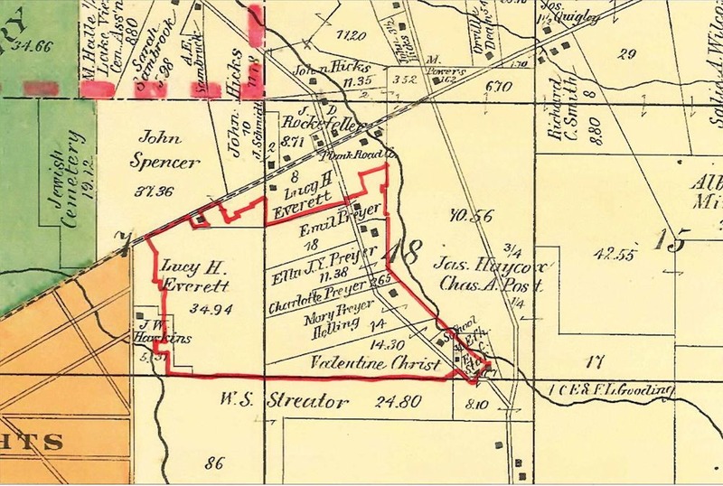 Future Site of Mayfield Heights, 1892 The future site of Mayfield Heights, shown in this detail from a plate in the 1892 Cram atlas of Cuyahoga County, was farmland into the 1890s. Although M. M. Brown initially subdivided the former Everett farm just east of Coventry Road in 1896, he soon acquired and laid out streets on the former Preyer's Lake View Wine Farm, which itself was divided into several smaller parcels after John Peter Preyer's death. Source: Atlas of Cuyahoga and Cleveland, Ohio (Chicago: George F. Cram Co., 1892), plate 99