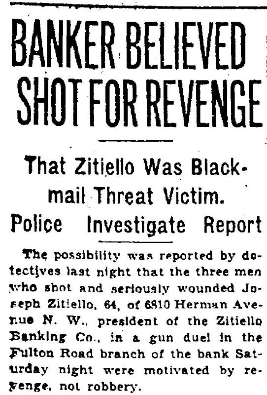 By 1910, Joseph Zitiello had achieved financial success as a butcher and began to engage in private banking. In 1916, he built the Zitiello Bank building on the corner of West 69th and Herman Avenue. In 1920, Zitiello, who by this time was known as the "King of the Italian Colony" on the west side of Cleveland, incorporated the Zitiello Bank. Later, the Zitiello Bank opened a branch office on Fulton Road. In 1929, while at this branch office, Joseph Zitiello was shot by several assailants who were attempting to rob the bank. Zitiello returned their fire, chasing the would-be robbers from his bank.