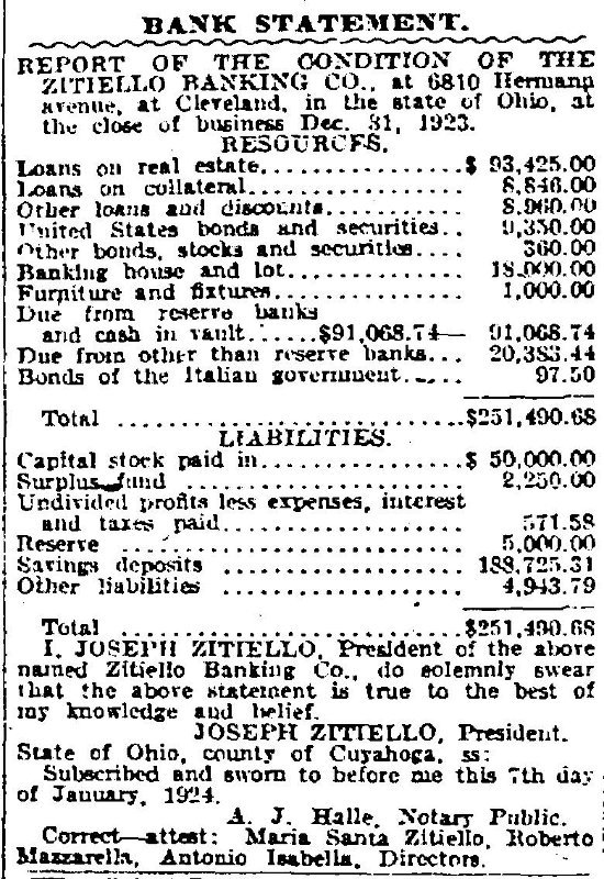 The bank was founded by Joseph Zitiello, an immigrant from the Campania region of Italy who came to Cleveland in 1898. Joseph was just one of several members of the Zitiello family who by 1910 had purchased homes on West 69th Street. As was customary with Italian immigrants, a number of the Zitiellos were proprietors of small businesses that were operated out of their homes. Joseph ran a butcher shop. Luigi was a saloon keeper. Pasquale was the neighborhood grocer.