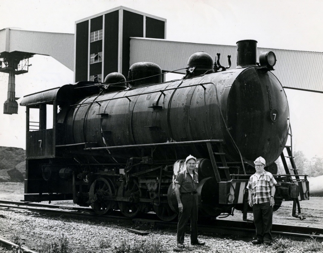 Steam Locomotive, 1977 In 1925, C.E.I. created its own subsidiary railroad company, the Avon Railroad Company, to handle the transportation of large amounts of coal to the Avon Lake plant. James Museone (left) and Albert Kissell (right) were the last two operators of the old steam locomotive at C.E.I.'s Avon Lake Power Plant. Source: Cleveland Memory Project, Cleveland State University Library Special Collections