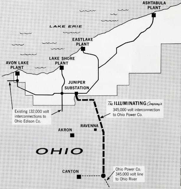 Expressway for Power Transmission, 1963 C.E.I.'s assistant general manager, E.E. Noble, stated just prior to the opening of the Avon Lake plant, "This territory, extending 100 miles along Lake Erie between Avon and the Pennsylvania state line, will surpass any other industrial area in the world." This illustration shows how C.E.I. placed in service a 345,000-volt line interconnecting its system with that of Ohio Power Co. Source: Cleveland Memory Project, Cleveland State University Library Special Collections