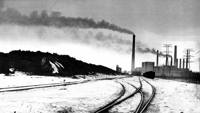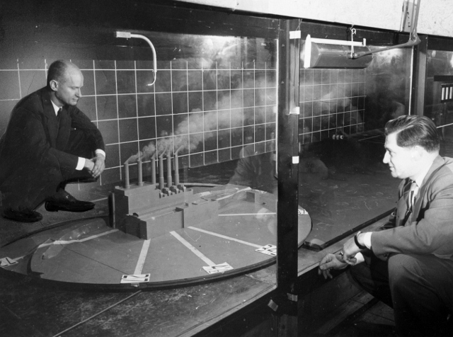Wind Tunnel Test at NYU, 1953 A scale model of the Illuminating Co.'s Avon Lake Power Plant was placed in a wind tunnel to check the effect of air currents' on stack smoke. The pollution generated by the Avon Lake Power Plant has been a controversial subject, one that has led to the planned shutdown of the plant in April 2015. Source: Cleveland Memory Project, Cleveland State University Library Special Collections