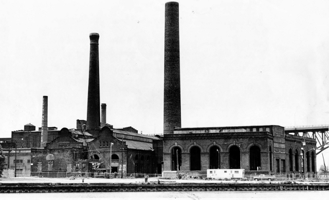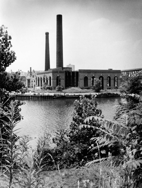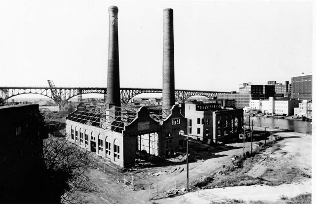 The Viaduct Power House was built in 1892 on the west bank of the Cuyahoga River. C.E.I., who powered the east-side rival of Hanna's west-side line, responded by building the Canal Road Station in the Flats in 1895. Thus situated on opposite sides of the Cuyahoga River, just across from each other, these two streetcar powerhouses were the only such facilities of their kind in Cleveland.