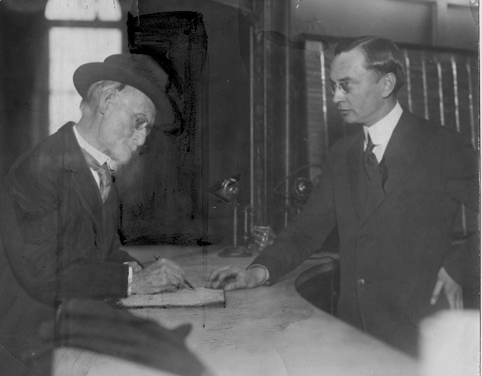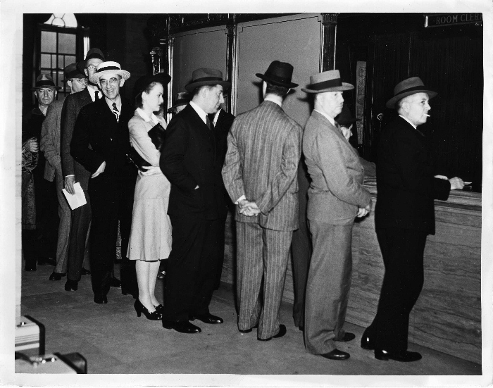 First Guest Signs In The first in a long line of guests to take advantage of the 1,000 room Hotel Cleveland signs his name. The facility built in 1918 was but one of a number of hotels to occupy the space at Public Square. Source: Cleveland Memory Project, Cleveland State University Library Special Collections