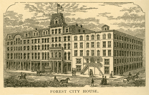 Forest City House Engraving, 1876 Forest City House was a hotel located on the corner of Superior Street and Monumental. The structure was later replaced with the new Hotel Cleveland building. Source: Cleveland Memory Project, Cleveland State University Library Special Collections