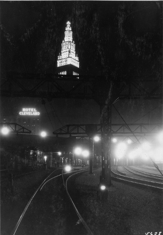 Hotel Cleveland Lit Up A nighttime approach from the west side sometimes made the Terminal Tower look like it was floating in the air near the Hotel Cleveland sign. Source: Cleveland Memory Project, Cleveland State University Library Special Collections