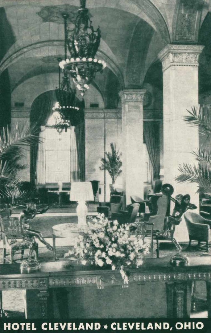 Lobby in the 1930s The lobby of the Hotel Cleveland also became an image used in postcards. The interior design and fine furnishings created an atmosphere of luxury for visitors. Source: Cleveland Memory, Michael Schwartz Library Special Collections at Cleveland State University Date: ca. 1938