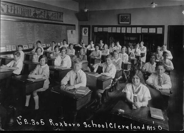 Today the Roxboro campus in Cleveland Heights houses an elementary and middle school with the same name, but at one time a third school building stood on the current footprint of the schools's auditorium. The Cleveland Heights - University Heights School District's first building on the site was Roxboro School, designed by George Hammond in 1905. A simple brick schoolhouse, it looked very similar to the Lee Road School built in the same era. Roxboro, which stood near the western edge of the Van Sweringen brothers' fledgling Shaker Village development, was essentially a rural schoolhouse.