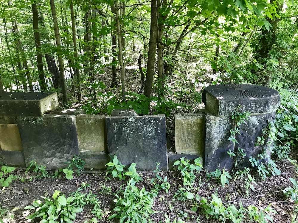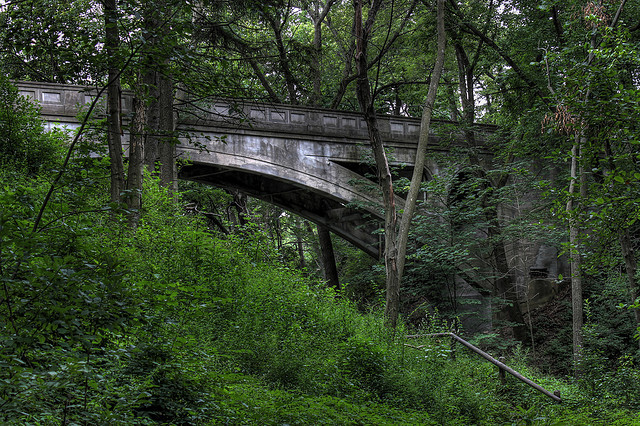 Supported by a steel superstructure and faced with Euclid bluestone quarried nearby, Forest Hill Park Footbridge traverses Forest Hill Boulevard in East Cleveland on land that was once part of Standard Oil tycoon John D. Rockefeller's summer estate. Spanning 347 feet across a deep valley in the Dugway Brook watershed, the 48-foot-high pedestrian bridge was intended to nestle in the hilly landscape of the Heights (the westernmost foothills of the Appalachians) on Cleveland's east side.