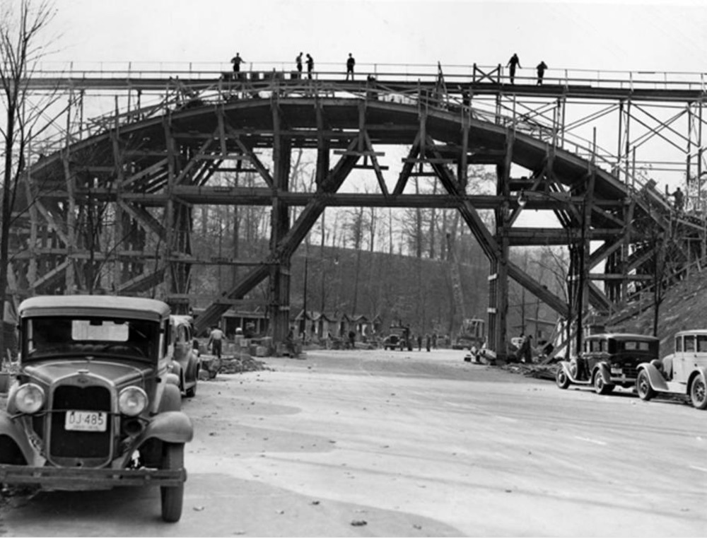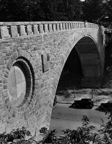 Designed by Wilbur Watson and Associates in 1939 with consulting architects F. B. Walker and A. D. Taylor, Forest Hill Park Footbridge was built in 1939-40--the work of more than 1,000 men toiling for two years. The men were paid with Works Progress Administration funds as part of its plan to put unemployed Americans back to work on useful projects. Wilbur Watson was a nationally known civil engineer and bridge designer who also engineered the Lorain-Carnegie Bridge over the Cuyahoga River. Taylor, who planned Forest Hill Park for the Rockefellers, was president of the American Society of Landscape Architects and a protege of the Olmsted firm founded by Frederick Law Olmsted, the "father of landscape architecture" who co-designed New York's Central Park. Taylor's sensibilities are reflected in the picturesque bridge.