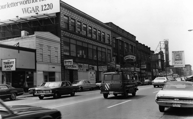 Euclid-East 105th Area, 1970 This photo shows a number of businesses either owned by or leased from Winston Willis. In the background, Keith's 105th Theater is visible. By 1970 it housed an adult theater. Other businesses in that block included a thrift store, Bosa Nova Cocktail Lounge, Little Floyd's Riviera Lounge, Down Beat Swings nightclub, and Pussycat CineX, Psychedelic Shack restaurant, and Adult Cinema and Bookstore, among others. Source: Cleveland Public Library Photograph Collection Date: 1970