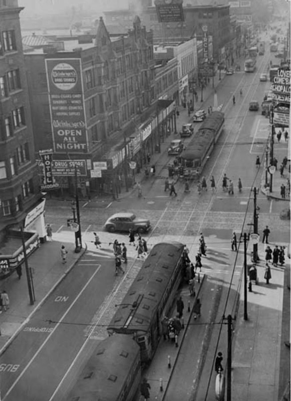 Euclid-East 105th Area, 1946 This aerial view faces west, with the intersection of Euclid Avenue and East 105th Street in the foreground. Streetcar lines ran directly from the Heights to the Euclid-East 105th area, making the district a popular destination for East Side suburban residents. Often called Cleveland's second downtown, the center offered many of the same opportunities as downtown on a smaller scale before the advent of suburban shopping malls. Source: Cleveland State Library. Special Collections. Cleveland Memory Project Date: 1946