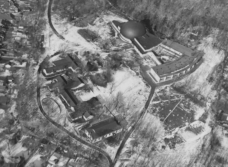 Aerial View of Park Grounds, 1952 The buildings at left are the Park School facilities. The congregation bought the land to relocate its synagogue in 1942. Mendelsohn's building included the sanctuary, courtyard, and classrooms to the right. Source: Cleveland Memory Project, Cleveland State University Library Special Collections