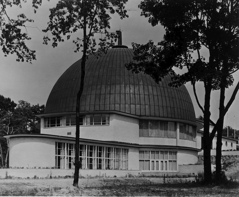 Park Synagogue Architect Erich Mendelsohn designed the main and lower sanctuaries seen as the domed space and the windowed space in this photo. The dome is reinforced concrete covered with a copper roof. Clear glass windows surround the drum at eye level to enable outdoor imagery. Source: Cleveland Memory Project, Cleveland State University Library Special Collections