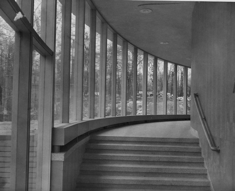 The Glass Hall Descending to the lower chapel, Mendelsohn's use of large windows is evident. Source: Cleveland Memory Project, Cleveland State University Library Special Collections