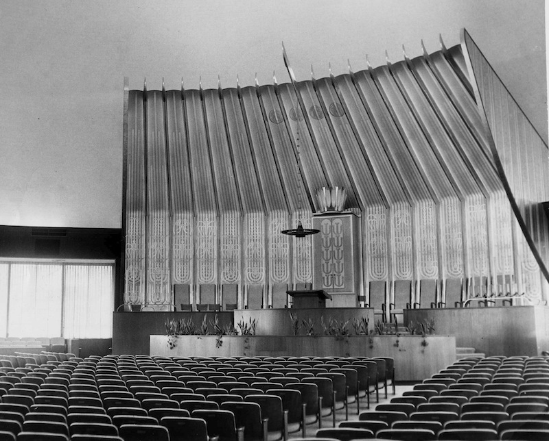 Rabbi Cohen was instrumental in bringing Mendelsohn to Cleveland. During his first visit, Mendelsohn sketched his ideas on a blackboard and immediately won the synagogue building committee’s approval to move ahead. The new Park Synagogue would be one of the architect’s first American synagogue commissions, although he would go on to design several others. In all, four were constructed, all in the Midwest. During the course of synagogue planning, the architect also remodeled much of the interior of Rabbi Cohen’s own home on Euclid Heights Boulevard, to conform with International Style principles. Dedication activities for the as-yet-unfinished project were held in December, 1950. Building activity for the original structure was completed by 1953.