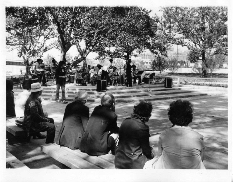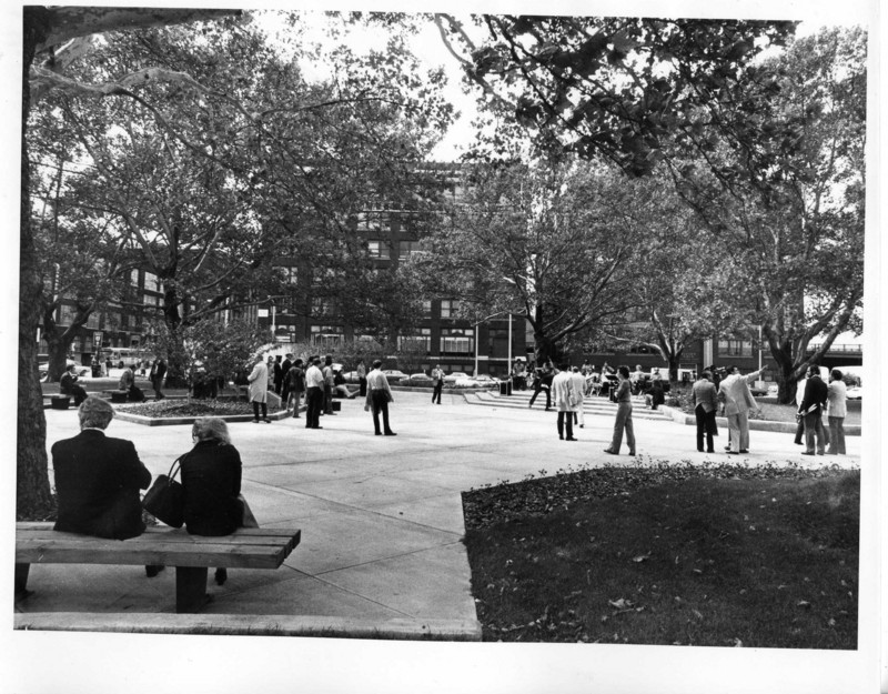 In 1977, the city decided to revitalize the park. It put up $75,000 for a complete restoration in time for the 40th anniversary of the first dedication. The plans were a source of contention between the city and the Early Settlers Association. The designer, Berj A. Shakarian, and the council favored a design which reflected the Courthouse next door and its history. The Early Settlers Association insisted on the continued memorialization of Fort Huntington. It had been determined that Fort Huntington actually stood about 500 feet northwest of the park, part of the reason the city favored a redesign. Despite the Association's protests, Shakarian's design was put into action. New walkways, benches, a stage, and plants were added. The park commemorated Fort Huntington in name only.