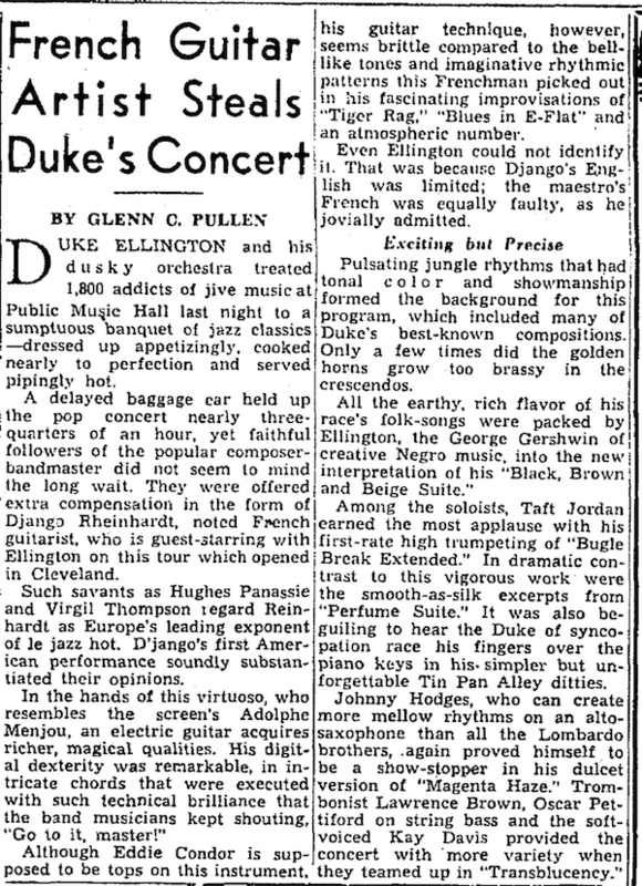 After a 45 minute delay while the musicians awaited the arrival of a baggage car carrying Ellington Orchestra's instruments, the crowd finally heard Django Reinhardt's first U.S. performance. The act was such a hit that Reinhardt and Ellington would go on to play in other major cities in the Midwest before concluding their tour in New York City at Carnegie Hall.