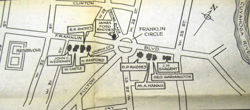 A Circle for the Wealthy This map which appeared in a 1975 Cleveland Press article shows the footprints and owners' names of the mansions and estates which surrounded Franklin Circle in the late nineteenth and early twentieth centuries. On the southeast side of the Circle are the mansions of Daniel P. Rhodes and his son-in-law Marcus Hanna. On the north side is the mansion of Daniel's son and famed historian, James Ford Rhodes. On the southwest side of the Circle is the mansion of Daniel Rhode's other son and notable businessman and philanthropist, Russell R. Rhodes. Other mansions and their owners are noted as well. Image courtesy of Cleveland State University Library, Press Collection