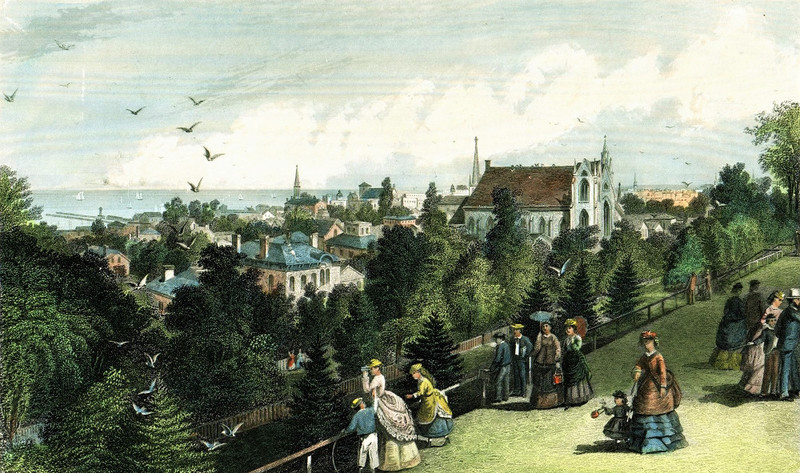 A West Side Promenade Walk Wealthy Franklin Circle and Franklin Avenue neighborhood residents conduct a promenade walk on the Kentucky Street Reservoir in this c. 1870 painting. The Reservoir, which no longer exists, was located several blocks west of Franklin Circle on the south side of Franklin Avenue between Kentucky (W. 38th) Street and Duane (W. 32nd) Street. The church seen on the right side of the painting is the Franklin Avenue Methodist Episcopal Church, built in 1870. It, like the Reservoir, no longer exists. Creator: Cleveland State University, Press Collection, and Encyclopedia of Cleveland History