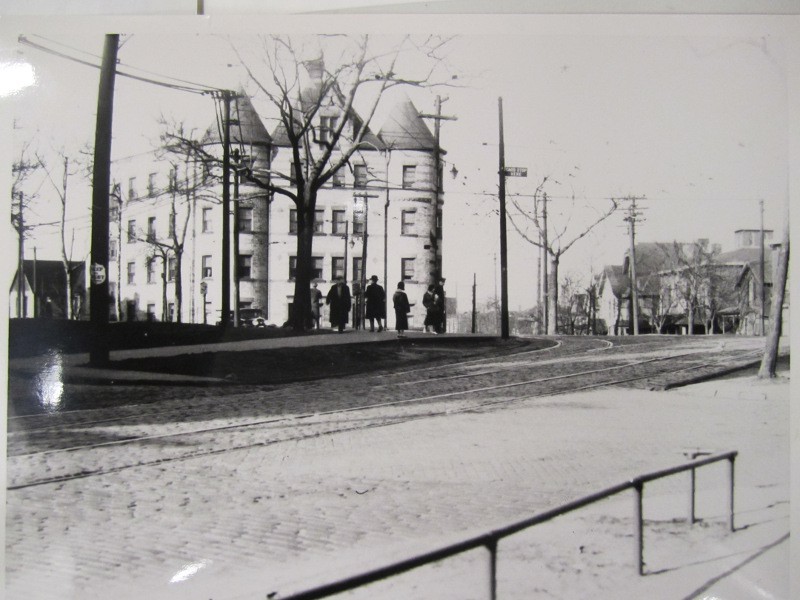 Street car tracks through the Circle This undated photo taken in the early twentieth century shows the streetcar tracks on Franklin Avenue near the Circle. The tracks were installed in the years 1907-1908 and destroyed the nature-like setting of Modoc Park. After the tracks were constructed through the Park, the park area became known simply as Franklin Circle. The building in the background with the turreted towers is the Beckwith Apartment building. Built in 1899, it stood on the Circle until it was razed at some time after 1981. Source: Cleveland Public Library, Photograph Collection