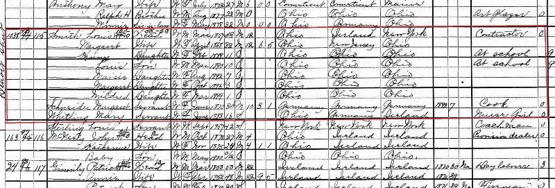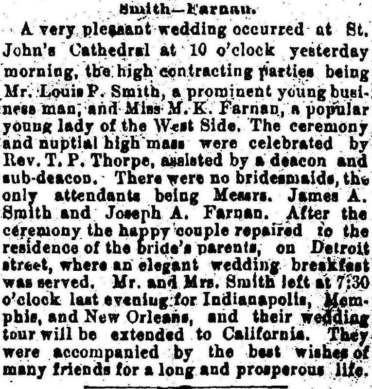 The wedding of Louis Patrick Smith and Margaret Farnan in January 1888 was a society event in Cleveland that year. Louis was the oldest son of Patrick Smith, who, according to an 1885 article appearing in the Cleveland Leader, was listed among Cleveland's millionaires--a list which included John D. Rockefeller, Mark Hanna, and other nineteenth century Cleveland "captains" of industry. The bride Margaret Farnan also came from a wealthy family. Her grandfather, Walter Farnan, who like Patrick Smith was an immigrant from Ireland, in 1852 founded Farnan Brass Works, the first brass foundry in Cleveland. Perhaps not to be outdone by her new son-in-law's wealthy family, Margaret Farnan's mother Mary, according to County deed records, gave the newly wed couple a part of the Farnan estate located along Detroit Avenue between West 70th and West 73rd Streets, including the land upon which the house at 7200 Detroit Avenue presently stands.