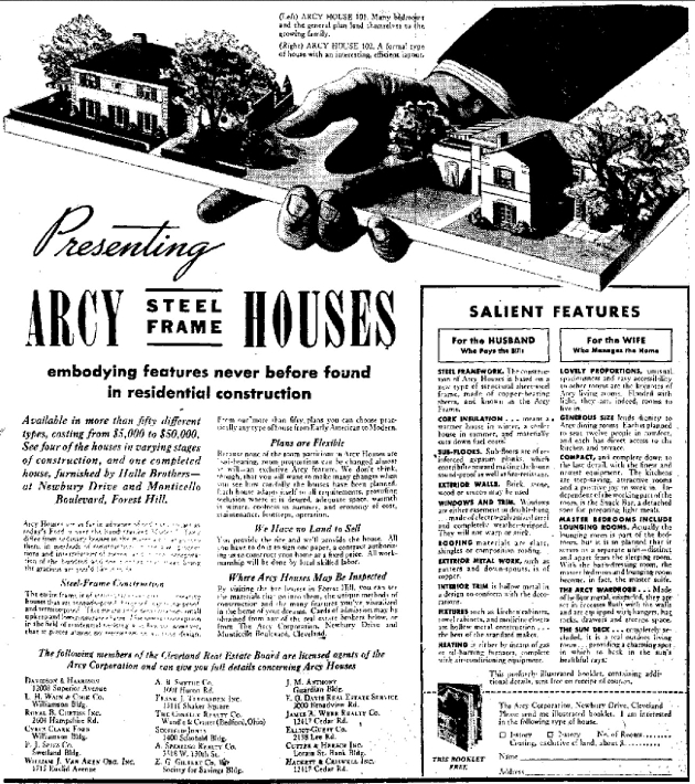 Arcy Ad, 1936 This advertisement touts Arcy's unique construction method, which combined structural steel and sheet steel covered by cork insulation and faced with brick or stone. Arcy Corporation, based in New York, built five homes in the $15,000 range in Forest Hill. One of them, at Monticello and Newbury Drive, was furnished by Halle Bros. department store as a demonstration. Its plans to build many more such houses fell through amid Depression woes. Image from Plain Dealer, November 29, 1936