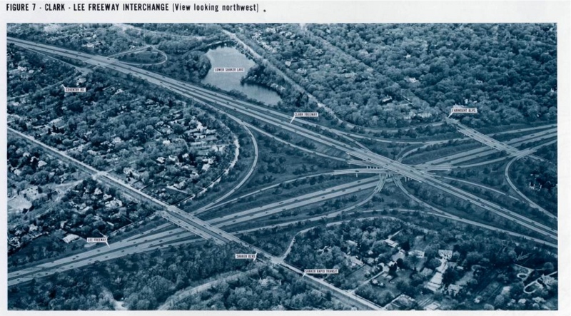 Proposed Highway Interchange This artist's rendering shows the 1960s proposal for a highway interchange just east of Lower Shaker Lake. The Clark and Lee Freeways would have intersected where the Nature Center of Shaker Lakes is now located. Lower Shaker Lake would have remained mainly intact, but with the Clark Freeway running alongside its entire southern shore. Source: Cleveland State University. Michael Schwartz Library. Division of Special Collections. Date: ca. 1960s