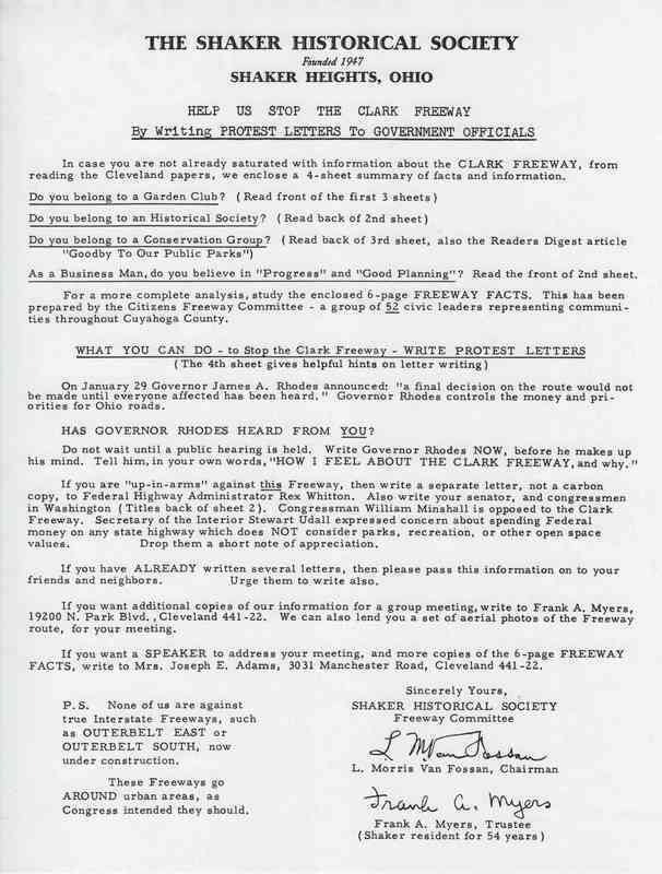Protest Letter How-To This is a 1967 flyer from the Shaker Heights Historical Society urging concerned residents to protest the freeways being proposed and showing them how to get involved in the fight. Source: The Shaker Historical Society Date: 1967