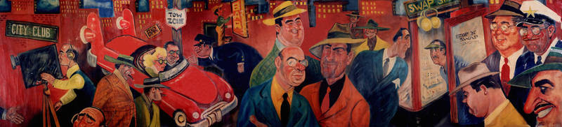 Bill Roberts Mural This original full-size mural by Cleveland Press artist Bill Roberts once hung at Kornman's restaurant in Short Vincent and the Press Club of Cleveland before it was donated to the Western Reserve Historical Society. The reproduction, photographed by Tim Ryan, was now on display at Nighttown restaurant in Cleveland Heights, Ohio, "home" of the Press Club of Cleveland.  Source: Cleveland Memory, Michael Schwartz Library Special Collections at Cleveland State University Creator: Bill Roberts; Tim Ryan