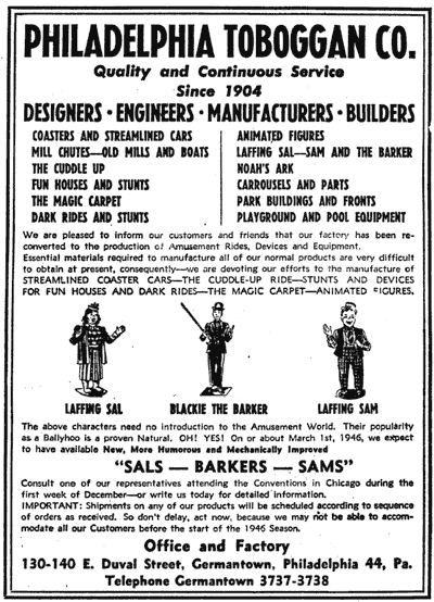 Laughing Sal, however, was not unique to Euclid Beach Park and Cleveland. In fact, in the 1930s the Philadelphia Toboggan Company (PTC) mass-produced Laughing Sals (as well as 'Laughing Sams') and sold them to amusement parks across the United States. The Old King Cole Papier Mache Company of Canton, Ohio got the contract from PTC to actually build the Sals, tweaking their laughing, papier mache Santa Claus model for the job. Sal's gyrations were created by two rotating cams (or discs) attached to a single motor in her hips. Springs in her arms, head, and chest provided even more movement. Sal's famous laugh emanated from a repeating record player hidden in the base of the figure. The combined effect of Sal's evocative appearance, constant motion, and endless laughter proved to be a hit with amusement park goers, and Laughing Sals became a fixture in fun houses during the 1930s. It appears that no more Sals were built by PTC and Old King Cole after the production of amusement park equipment temporarily ceased during World War II, however.