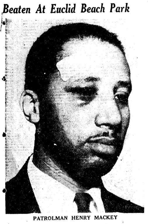 Henry Mackey Cleveland Police Patrolman Henry Mackey is shown following his scuffle with Euclid Beach Park Police on the night of the Euclid Beach Park Riot. Mackey and fellow CPD officer Lynn Coleman were both off duty when they got involved in an argument taking place in front of the dance hall, where black and white youths were challenging the park's segregationist policies. Coleman accidentally shot himself in the leg during the incident. The Euclid Beach Park Police officers were not charged. This photograph appeared in the Cleveland Call and Post and was not run in any other of the city's newspapers. Source: Cleveland State University. Michael Schwartz Library. Division of Special Collections. Cleveland Press Collection. Date: 1946