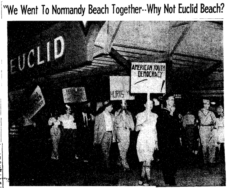 On August 4, 1946, almost one year after the dropping of atomic bombs on Japan and the end of World War ll, a picket line appeared in front of Cleveland's Euclid Beach amusement park for the first time in its history. Protesting the park's long-standing policy of excluding African Americans from using the park's roller rink, swimming facilities, and dance hall, an interracial crowd of over 100 picketers, including many uniformed World War ll veterans, held signs reading, "We Went to Normandy Beach Together — Why Not Euclid Beach?" Others compared the park's owner with the recently defeated leader of Nazi Germany: "Hitler and Humphrey believe in super race."