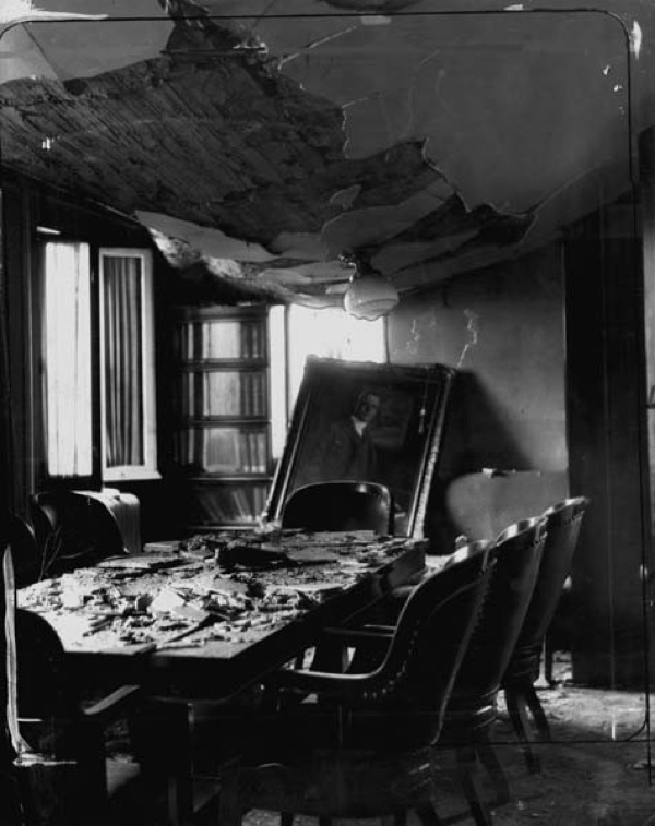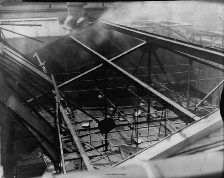 The steam acted as the primary catalyst, which caused the highly unstable nitrate film to decompose and emit a poisonous cloud of gas. The gas soon ignited creating two violent explosions, which rocked the clinic, practically blowing the roof off of the building. The explosions forced deadly fumes at a high rate of pressure into the pipe tunnel system and up the pipe ducts into nearly every room of every floor of the hospital almost immediately. The yellowish-brown smoke also found its way up the major stairways between each floor, thus trapping most of the 225 occupants of the hospital in an inescapable, terrifying cloud of imminent death. The toxic vapors caught most of the victims by surprise, as several doctors and nurses collapsed at their desks, while others only managed a step or two in their escape before kneeling over and dying. One hundred and twenty three victims almost instantaneously perished that day.