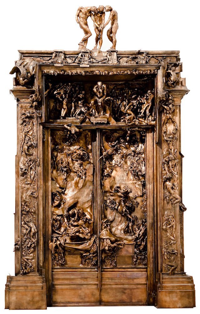 The Thinker is one of 25 identical twins: 900-pound bronze casts based on a 27-inch-high clay and plaster model created by Auguste Rodin in 1880. Rodin supervised roughly ten of these castings, including Cleveland’s, but he died shortly before installation occurred in 1917. The Thinker model was part of a commission for the proposed Museum of Decorative Arts in Paris. The museum was never built but a number of Rodin masterworks emerged, including The Gates of Hell, The Kiss and The Thinker, all inspired by Dante’s Divine Comedy. The bronze Gates of Hell (20 feet high, 13 feet wide and weighing eight tons) was slated to be the Museum’s front door. A small cast of The Kiss can be seen in the lower right section of the door. The Thinker (Le Pensure), originally entitled The Poet (Le Poète), resides atop the door panels. Some believe he is Dante observing his characters in The Inferno. Others postulate that The Thinker is Adam, musing about the destruction his sin brought upon mankind.