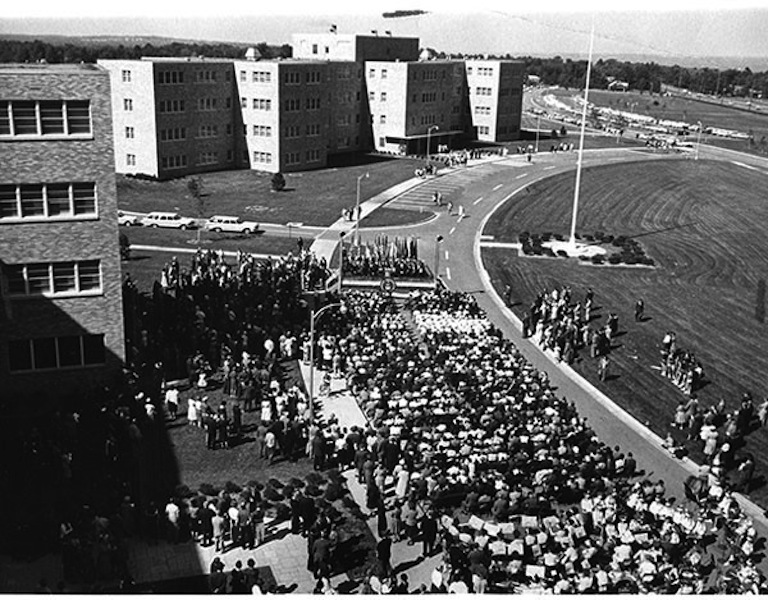 Dedication, 1961 View from atop the administration building. The dedication ceremony featured a parade of hundreds of veterans along with a full military marching band. Image Courtesy of Cleveland State University. Michael Schwartz Library. Special Collections.