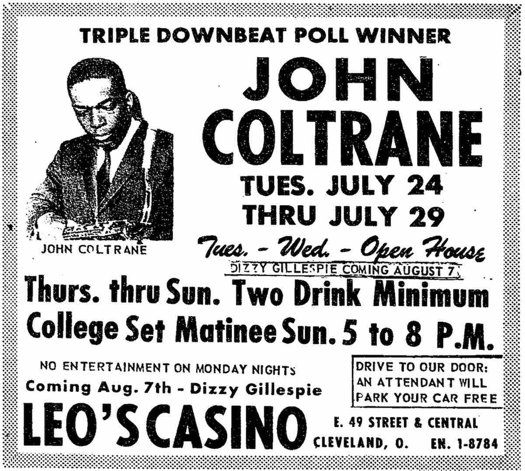 John Coltrane ad An ad for a John Coltrane concert at the old Leo's Casino at E. 49th and Cedar. Note the mention of a coming Dizzy Gillespie concert as well. Source: Call & Post, July 28, 1962