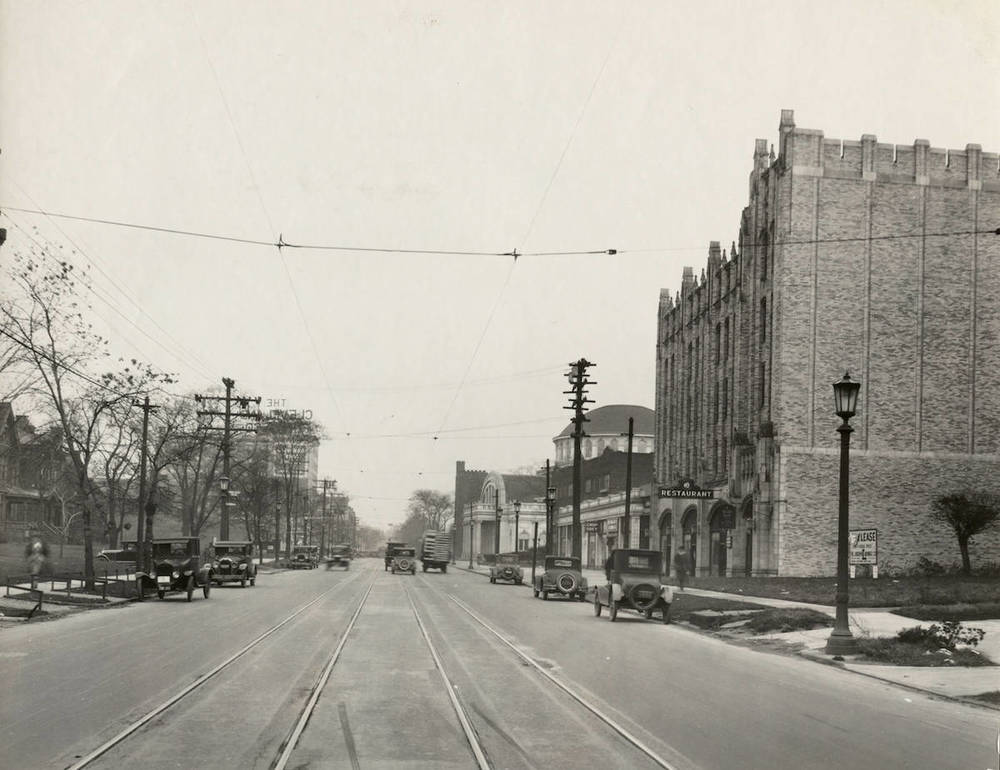 Looking East on Euclid Avenue with Quad Hall Hotel at Right Completed in 1925, Quad Hall was among many apartment buildings that rose along the former "Millionaires' Row" on Euclid Avenue in the Roaring Twenties. Source: Cleveland Public Library, Photograph Collection Date: 1927