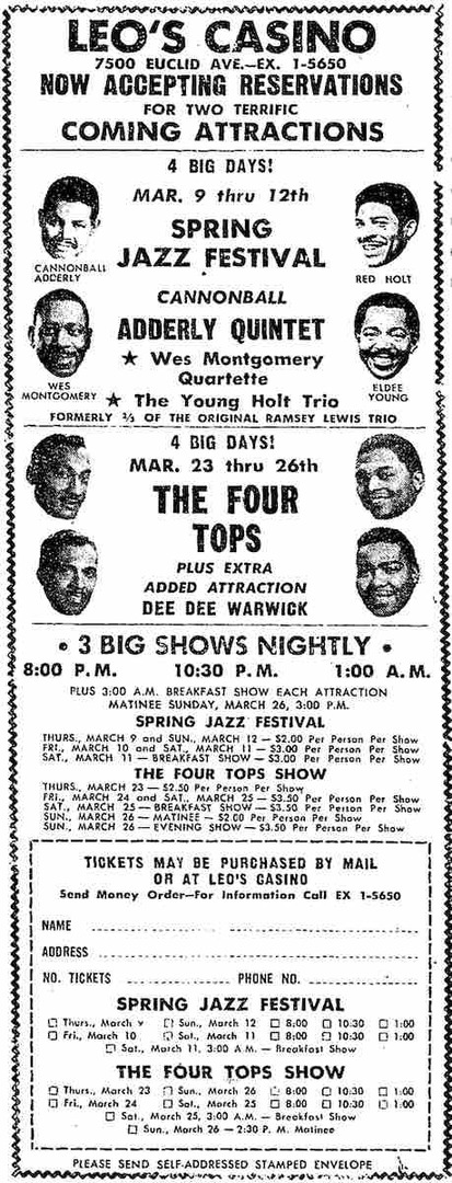 1967 Spring Jazz Festival Promo for the 1967 Spring Jazz Festival at Leo's Casino featuring Cannonball Adderley and, separately, four nights of shows by the Four Tops Source: Call & Post, February 25, 1967