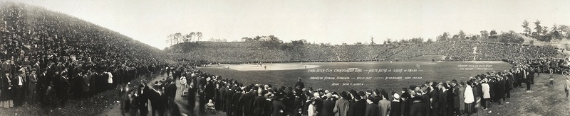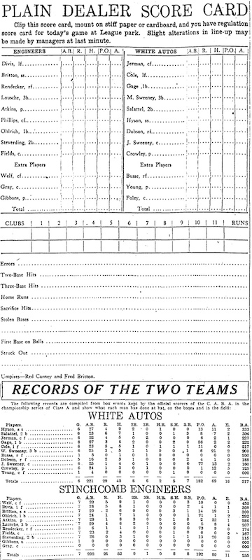 The match on October 10 was representative of everything amateur baseball could be: The White Autos of Cleveland were down three runs at the end the third inning. Pitcher Big Six Louis Crowley struggled against the Luxus, Omaha's championship team. The game turned at the bottom of the fourth inning. The Autos rallied with seven hits, three errors, two hit baseman and a sacrifice for a total of eight runs. The screams and cheers of the crowd amassed into a deafening roar that contributed to the chaos of the inning; the visiting team threw wildly and missed easy fly balls. The noise continued to stilt conversations and drown out a brass band performing for the occasion. Unable to recover, the Luxus lost by a score of 11 to 6. As soon as the umpire called the final out and the championship was secured, a crowd swarmed the field. Crowley was lifted on their shoulder, and impromptu versions of "The Star Spangled Banner" and "Hail, Hail, the Gang's all Here" were sung. A procession of trucks loaded with rooters and the band led the victorious White Autos down West 25th Street to the viaduct, and eventually to the Hollenden on Public Square. Once the festivities waned, the trucks drove the players back to East 79th Street- where the amateur team lived and worked at their sponsor's auto factory. The White Autos went on to win the national championship in San Francisco.